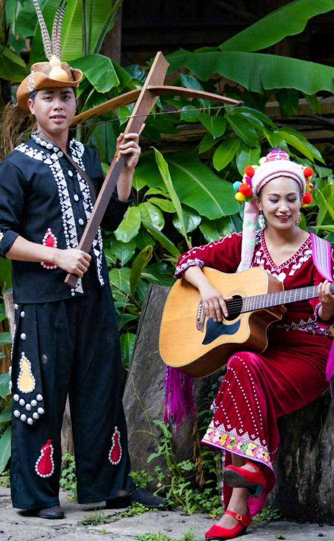 德昂族人口約1.7萬,主要分布在德宏州和保山市的潞西、梁河、瑞麗、隴川、隆陽等縣區。民居多為草排覆頂竹木結構的干欄式建筑,眼前的德昂村建筑納入了能容納數十人居住的德昂大房子,氈帽頂的小房子,還有頗具浪漫色彩的大公房、小公房……還建有“龍陽塔”標志及佛教奘房、佛塔。德昂族民間普遍信奉南傳佛教,民俗活動與佛事活動關聯緊密。潑水節、開門節、關門節是重大節日。德昂族服飾色彩豐富,口頭文學特別是民歌創作活動...